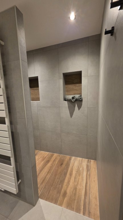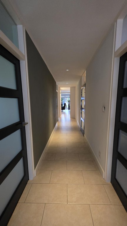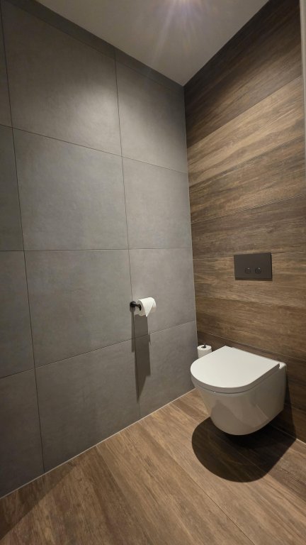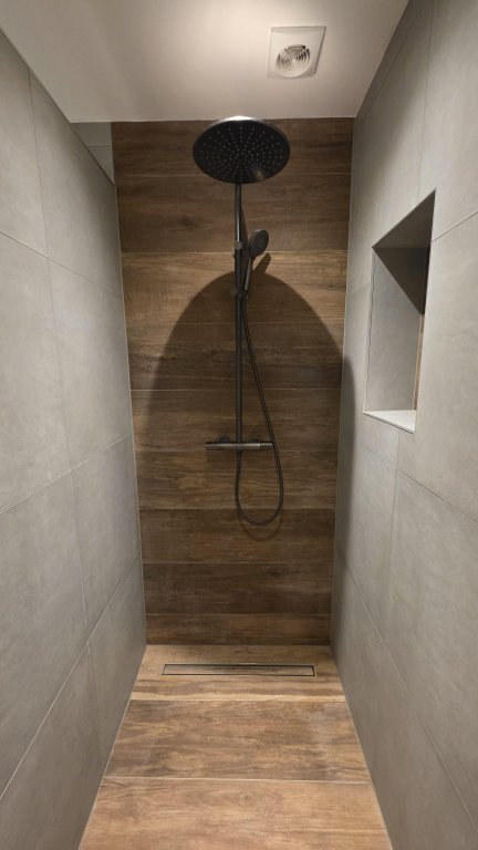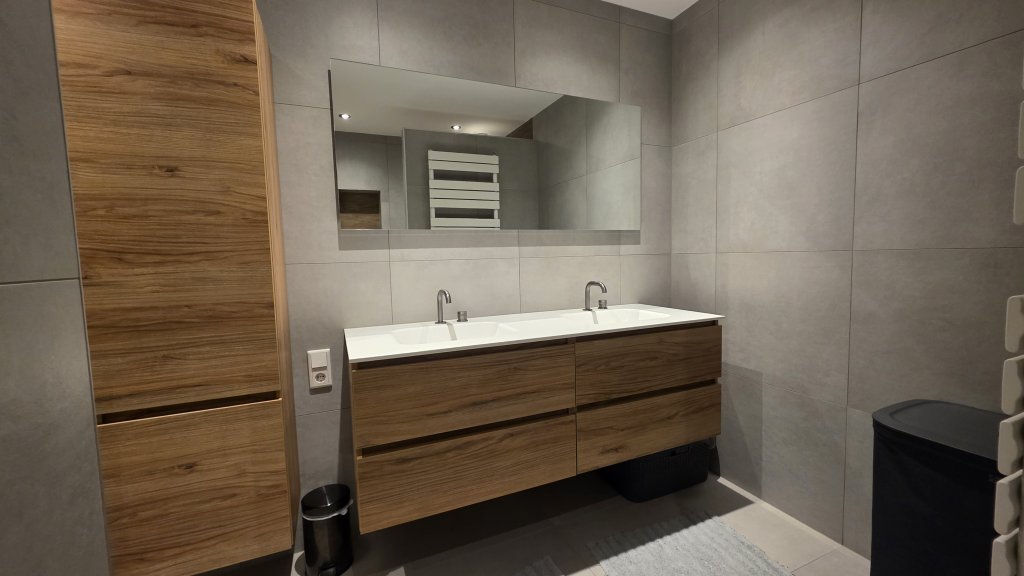 Aan de rechterzijde van de hal bevindt zich de ruime, moderne badkamer. Deze is voorzien van een hangend toilet bij binnenkomst en een separate natte ruimte met een stijlvol dubbel wasmeubel (voor hem en haar) en een grote, nette inloopdouche met luxe stortdouche.