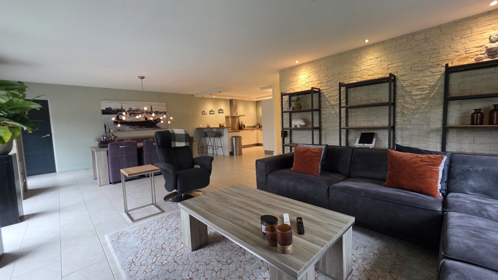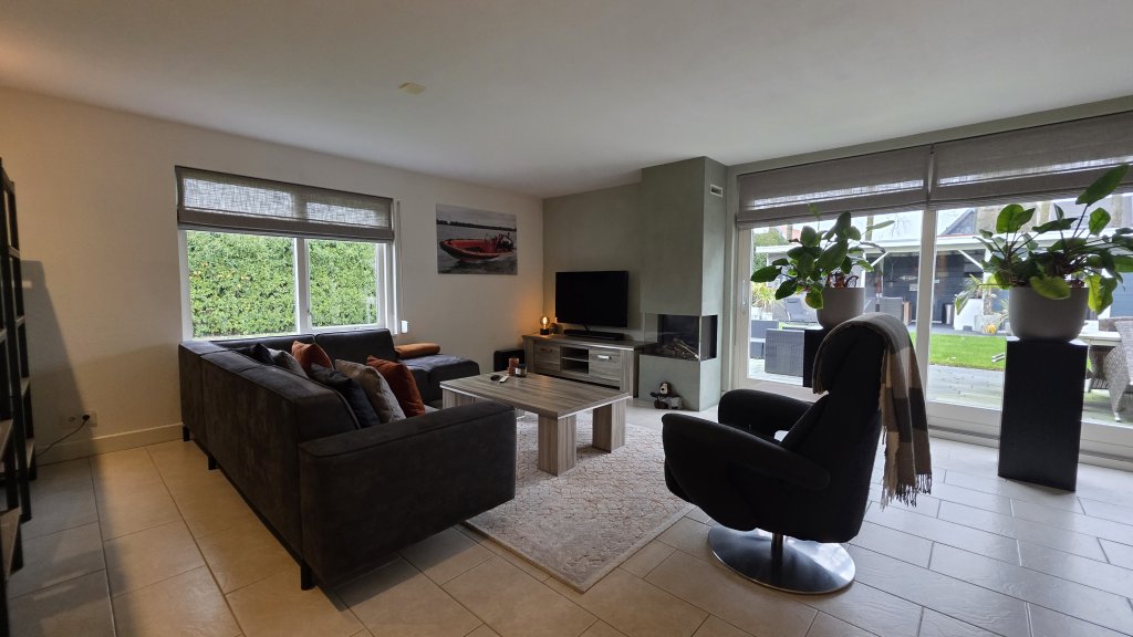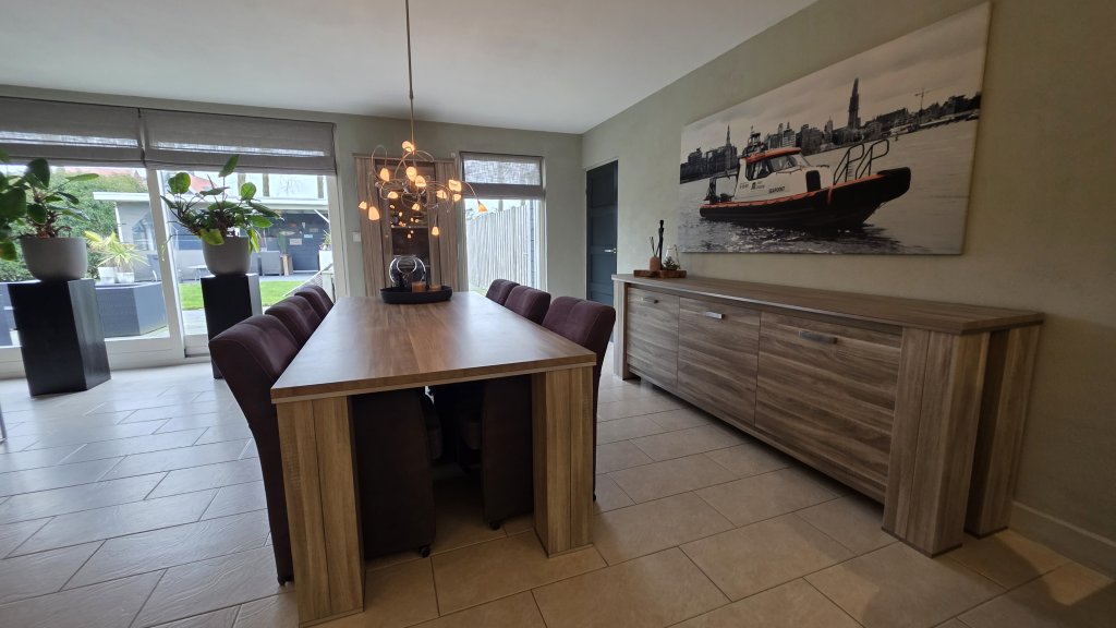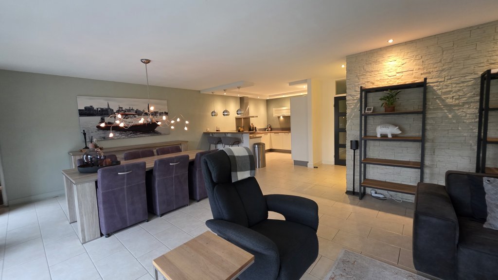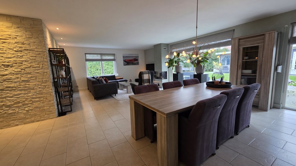 De woonkamer is smaakvol ingericht met een comfortabele zithoek, diverse kasten en een televisie met tv-meubel. Daarnaast is er een ruime eethoek aanwezig, geschikt voor acht personen, wat de woning ook zeer geschikt maakt voor representatief wonen.