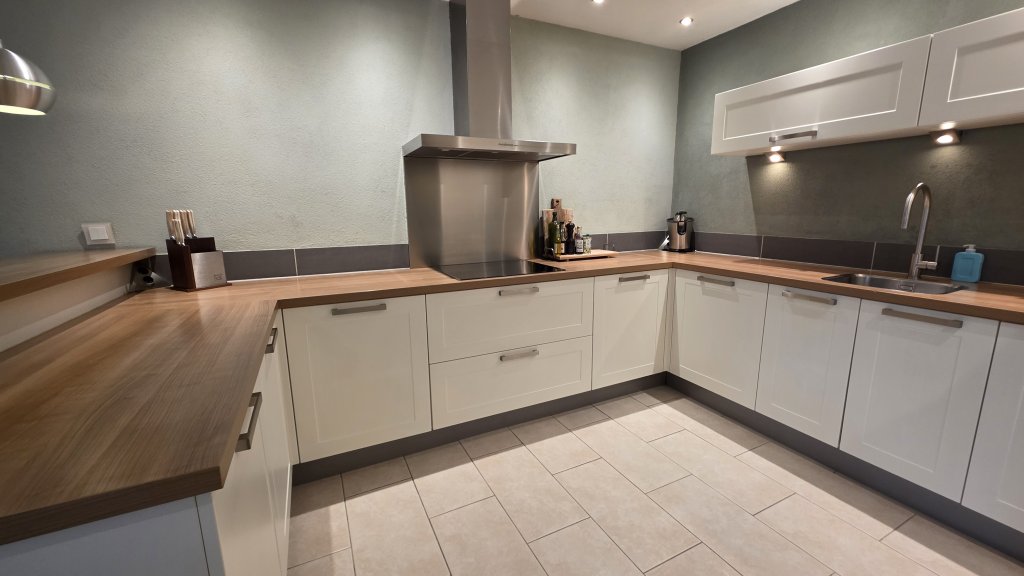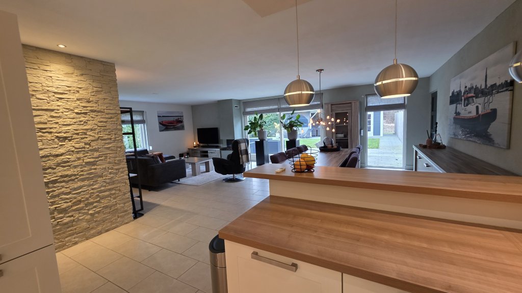 Aan het einde van de hal komt u in de royale, tuingerichte woonkamer met open keuken. De keuken is in een praktische U-vorm opgesteld en beschikt over alle moderne faciliteiten, waaronder een koelkast met vriezer, combi-oven, vaatwasser en inductiekookplaat. Het royale aanrechtblad en de vele opbergmogelijkheden maken deze keuken zeer compleet.