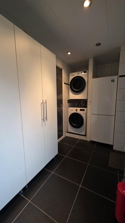 Aan de achterzijde van de woning bevindt zich de bijkeuken, voorzien van een wasmachine en droger. Vanuit de bijkeuken heeft u directe toegang tot de riante, lichte en verzorgde achtertuin.