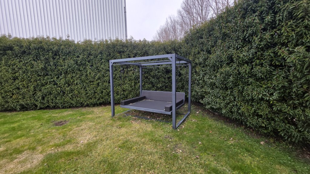 De tuin biedt meerdere zitmogelijkheden en is ingericht met een loungeset, een eettafel, een loungebank en een overdekt tuinhuis. In het tuinhuis is ruimte om met circa acht personen te dineren en is tevens een barbecue aanwezig.