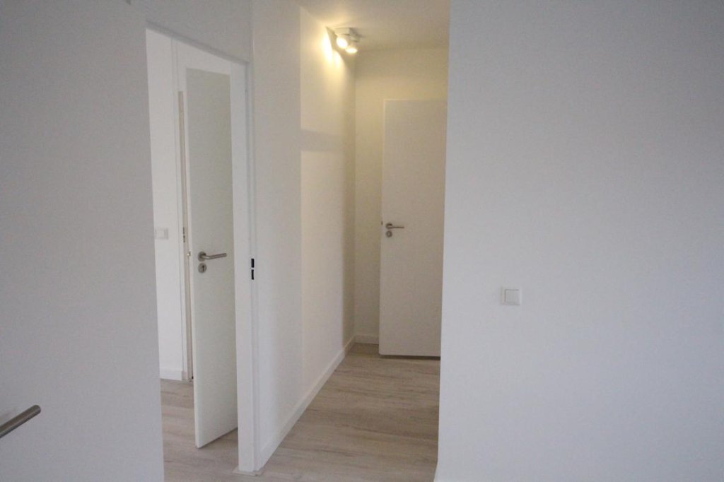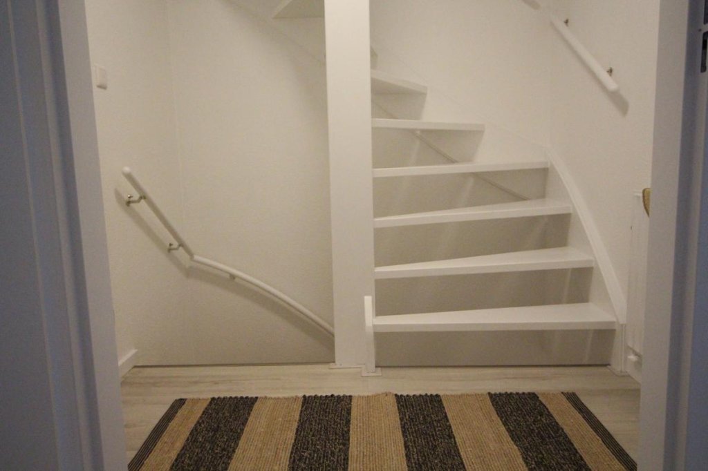Via de hal en trap bereik je de etage van het appartement. Hier bevindt zich een praktische bergruimte met aansluitingen voor een wasmachine.
