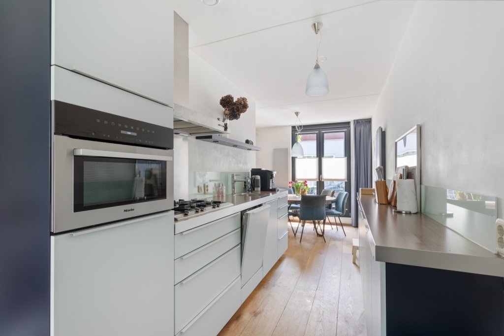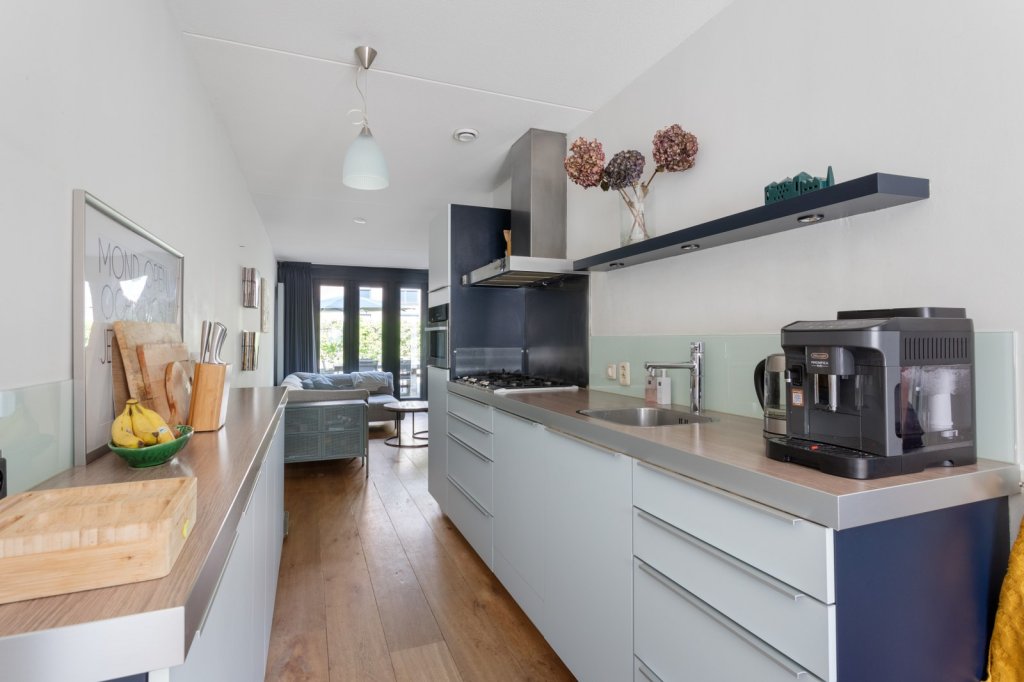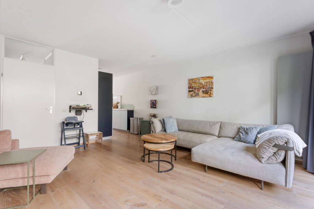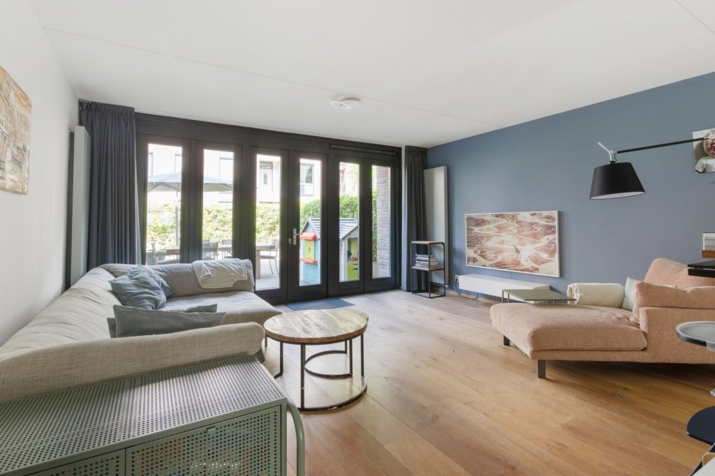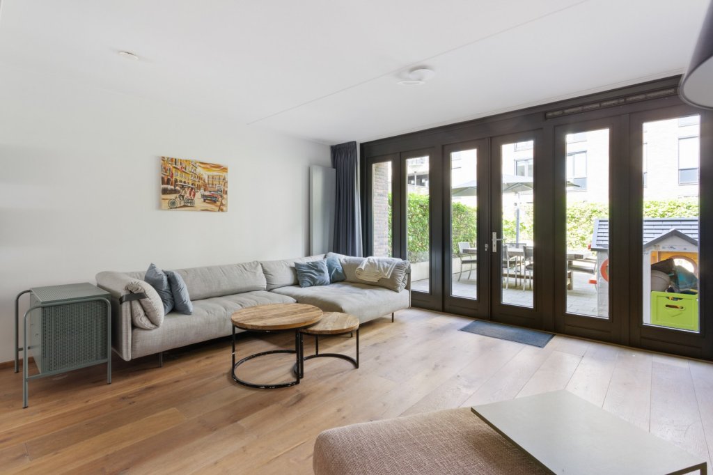 De woonkamer is gelegen aan de achterzijde van de woning en biedt middels openslaande deuren toegang tot de tuin. De keuken bevindt zich centraal tussen de woonkamer en eetkamer en is voorzien van een 5-pits gasfornuis, vaatwasser, koelkast en combi-oven.