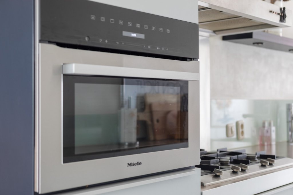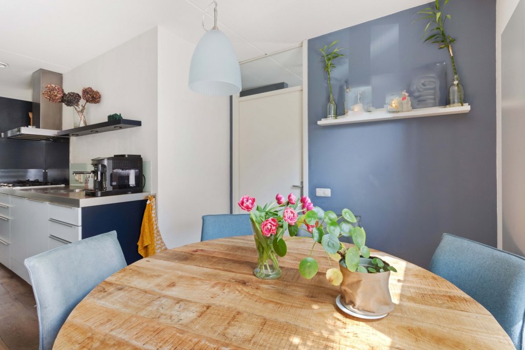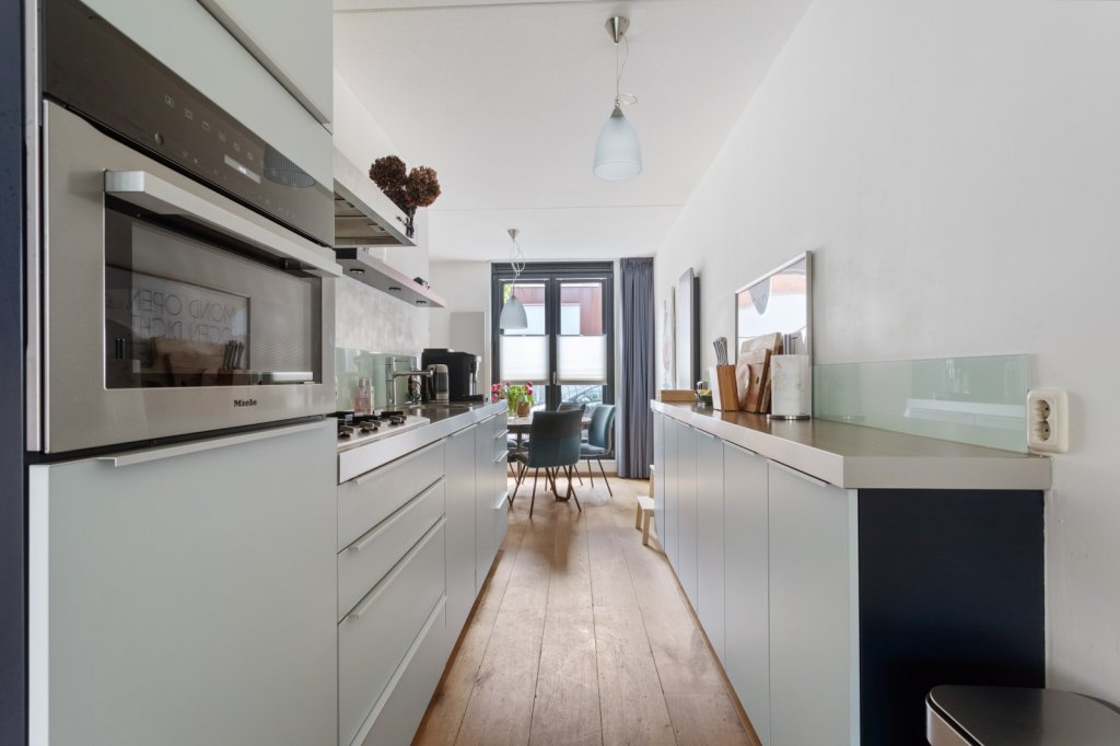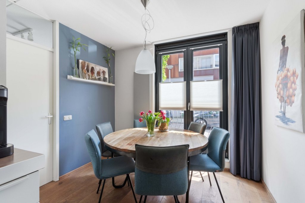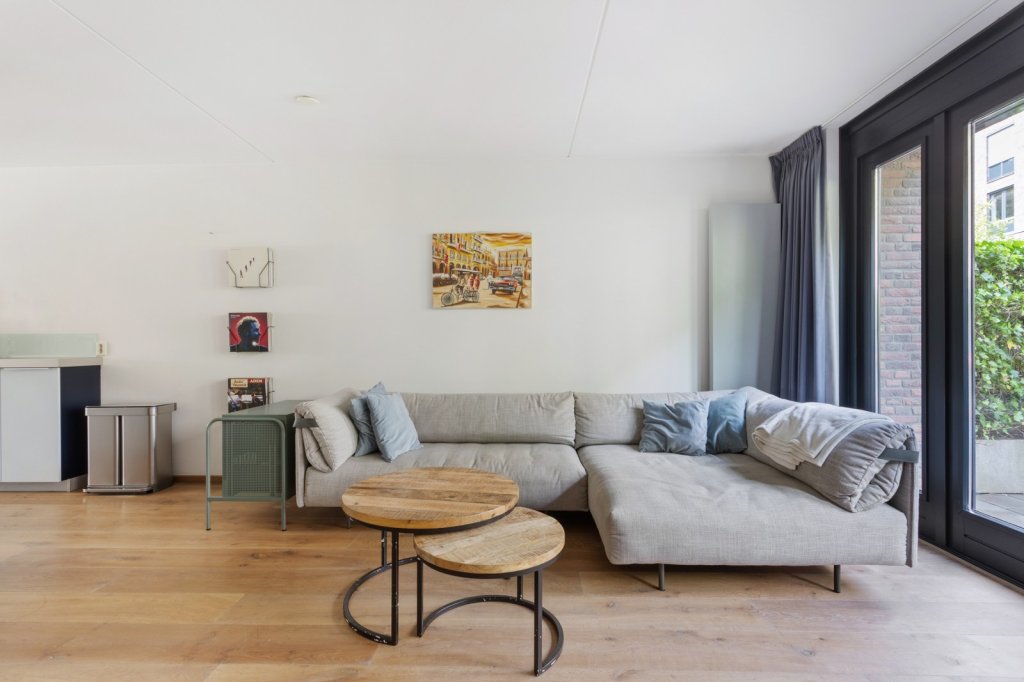 De woonkamer is gelegen aan de achterzijde van de woning en biedt middels openslaande deuren toegang tot de tuin. De keuken bevindt zich centraal tussen de woonkamer en eetkamer en is voorzien van een 5-pits gasfornuis, vaatwasser, koelkast en combi-oven.