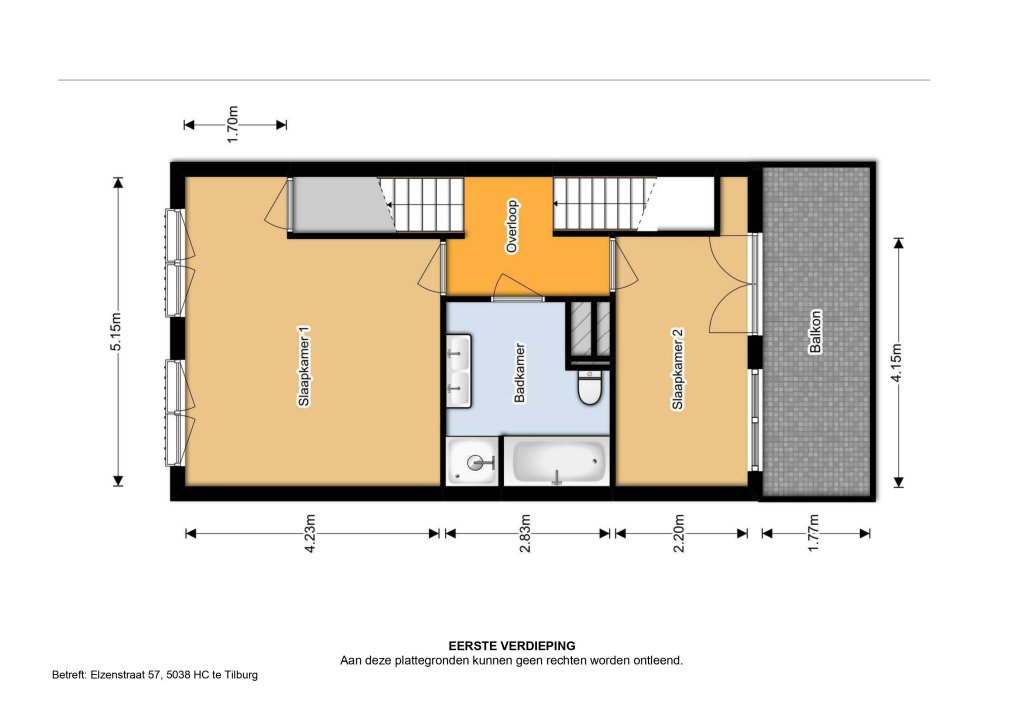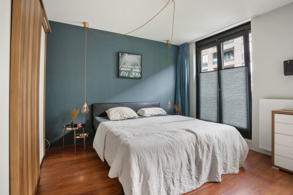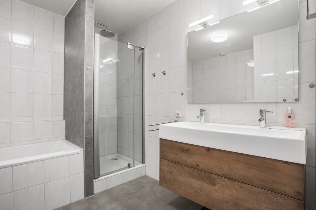 Hier bevinden zich twee ruime slaapkamers en de badkamer. De badkamer is uitgerust met een ligbad met douche, een aparte douchecabine, brede wastafel en een hangend toilet. De slaapkamer aan de achterzijde geeft toegang tot een zonnig balkon van circa 9 m² op het zuiden.