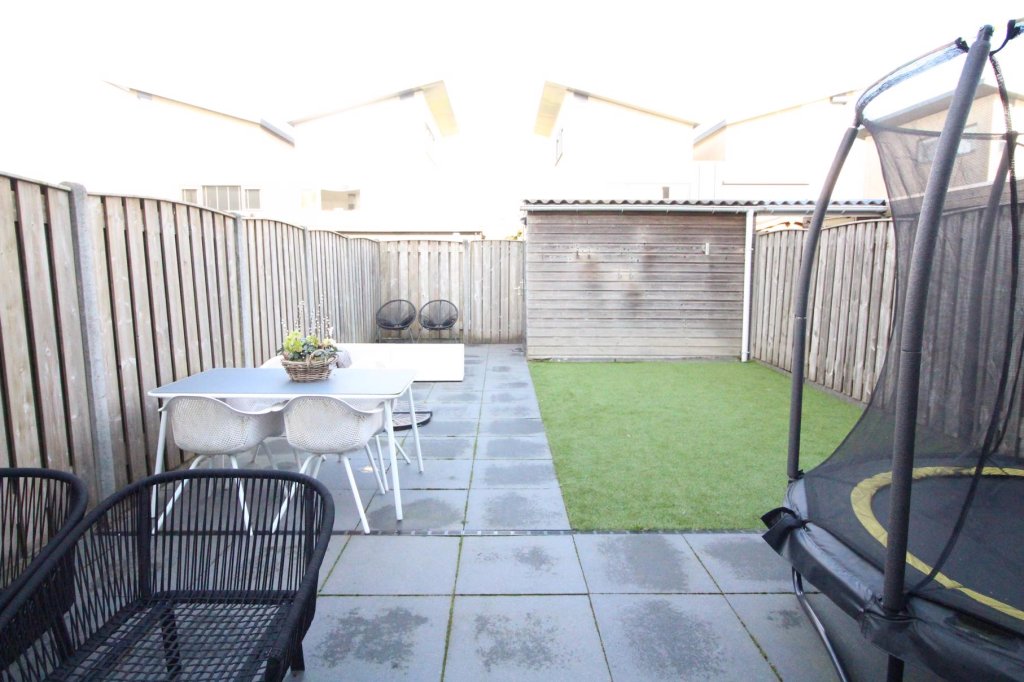 De achtertuin beschikt over een houten berging en een eigen achterom.