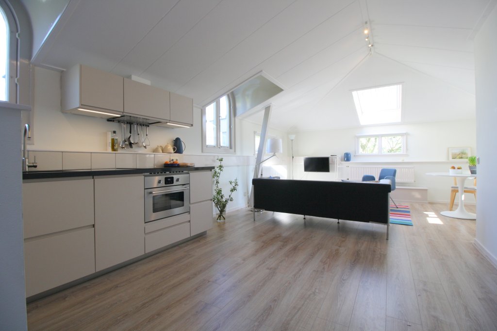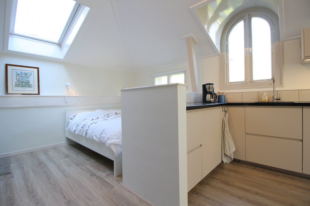 Door de hoge plafonds en fraaie dakconstructie heeft deze studio een zeer prettige woonsfeer. Moderne, strakke keuken die de woonkamer splitst van het slaapgedeelte. De keuken is voorzien van vaatwasser, oven, magnetron, 4-pits inductiekookplaat met afzuigkap en koelkast met diepvriesvak. Prettig slaapgedeelte met tevens veel lichtinval. Nette badkamer uitgerust met douche en wastafelmeubel. Het toilet is ideaal apart gesitueerd.