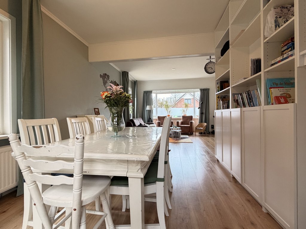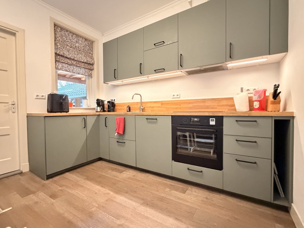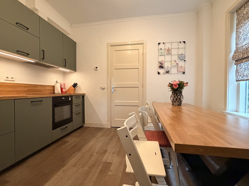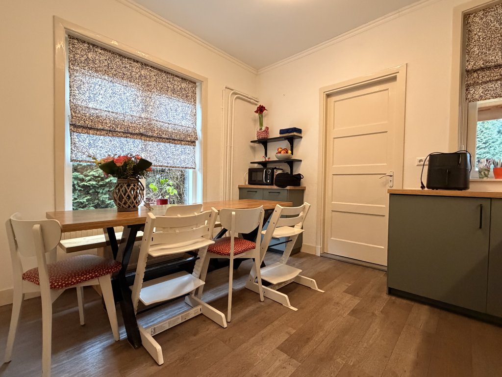 Entree, hal en toilet. Riante en lichte leefruimte, verdeeld in een eetkamer en woonkamer. De keuken is uitgerust met diverse inbouwapparatuur, waaronder een inductiekookplaat, afzuigkap, vaatwasser en oven. Vanuit de keuken is er toegang tot de bijkeuken met extra wasbak, wasmachineaansluiting en kastruimte. Aansluitend bevindt zich de badkamer, voorzien van een designradiator, douche en wastafel.