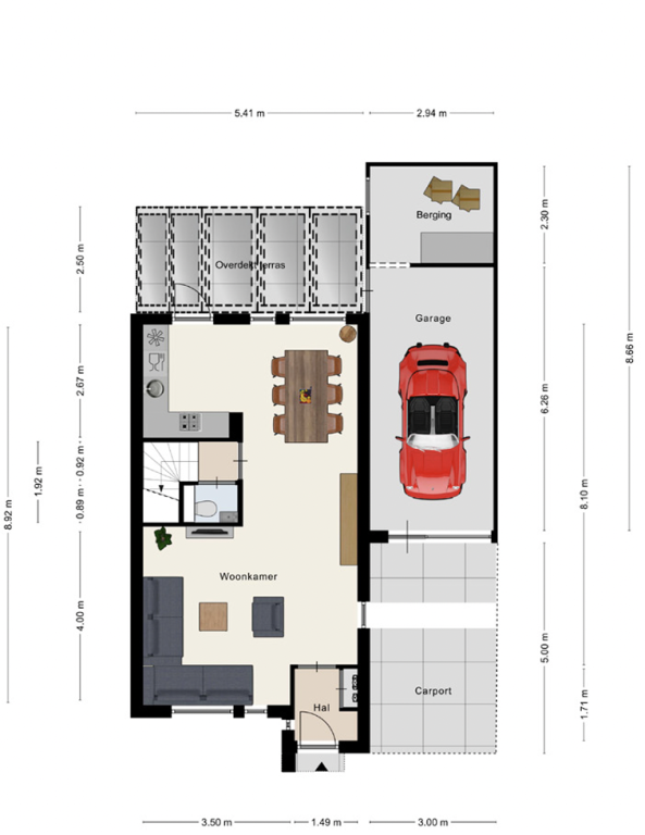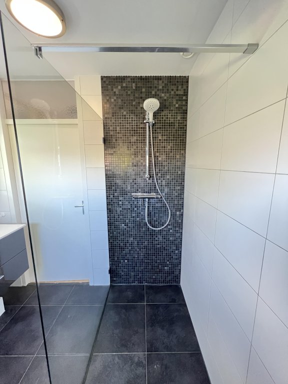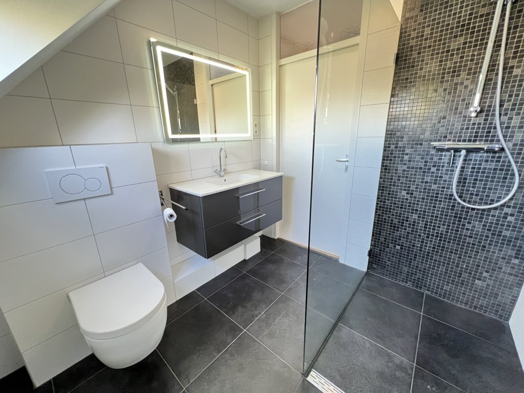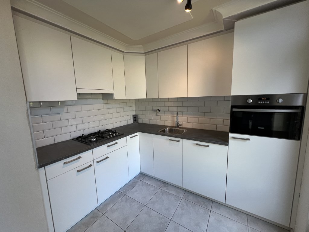 Lichte, U-vormige woonkamer met vloerverwarming met aan de voorzijde de living en aan de achterzijde de keuken met eetgedeelte en deur naar overdekt terras. Splinternieuwe keuken, voorzien van vaatwasmachine, combi-oven, inductiekookplaat, koelkast en vriezer.