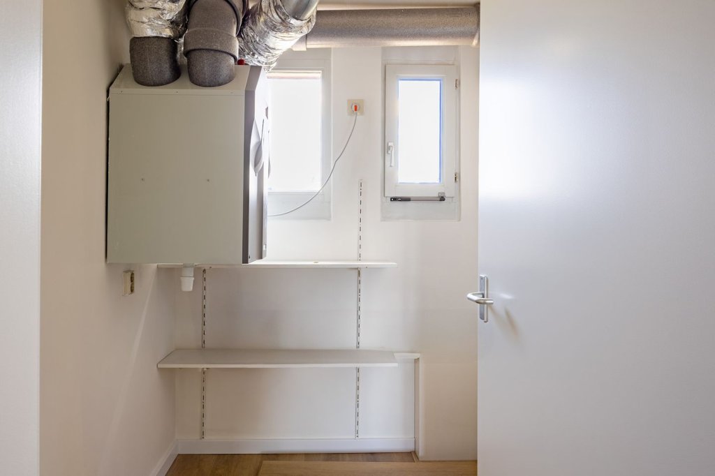Het appartement zelf beschikt over een royale woonkamer van ca. 53 m², een nette keuken en twee comfortabele slaapkamers (13 m² en 8,5 m²). De moderne badkamer is voorzien van een douche en wastafel, terwijl het separate toilet via de hal te bereiken is. Daarnaast is er een praktische berging/bijkeuken met aansluitingen voor witgoed.