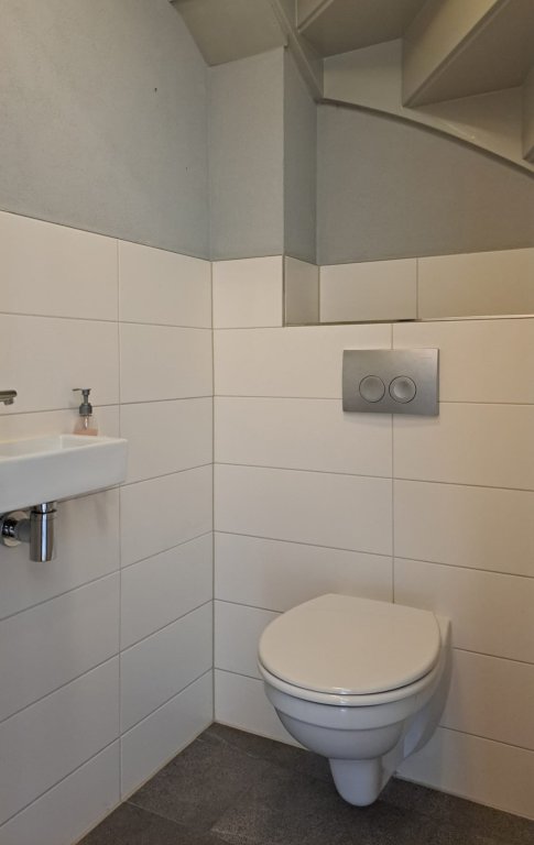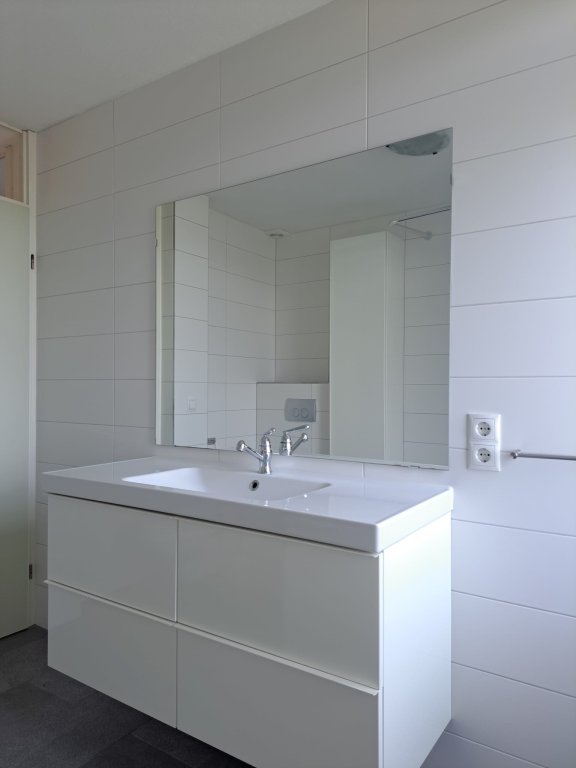 De moderne badkamer is voorzien van een toilet, ligbad met douche en dubbele wastafelmeubel met brede laden, spiegel en extra wandkast.