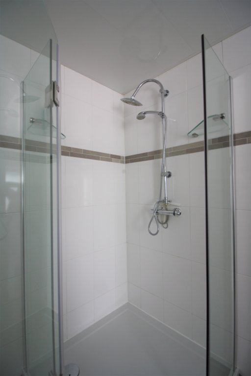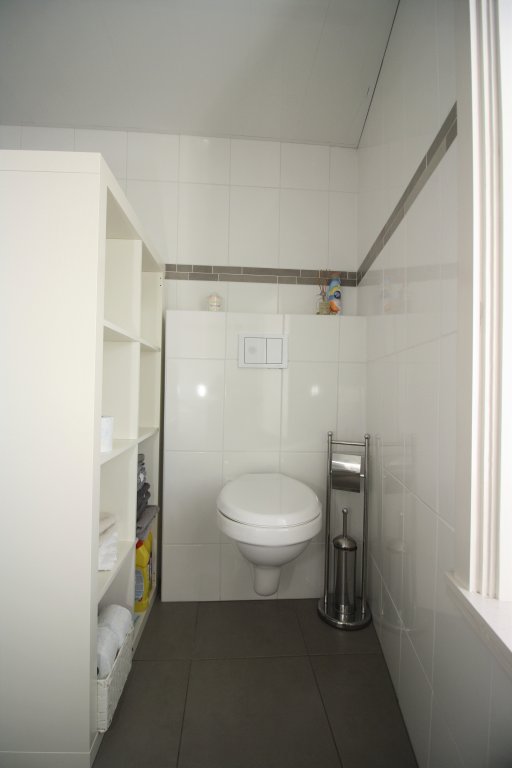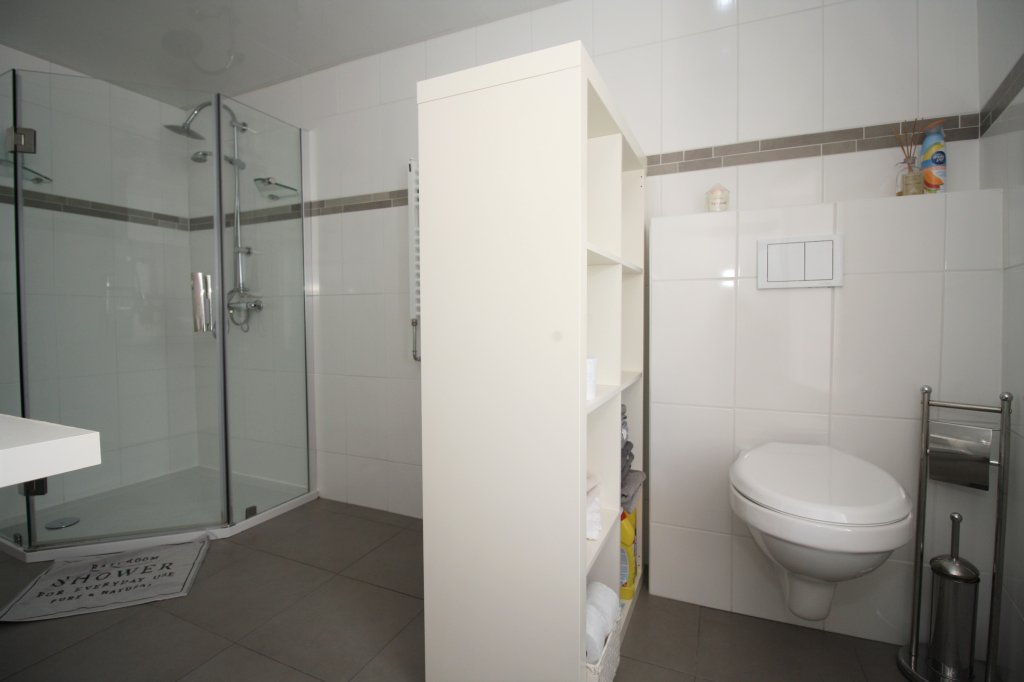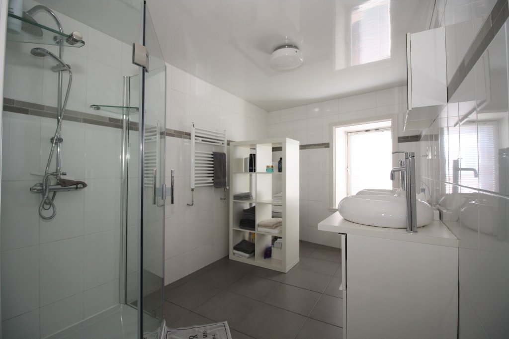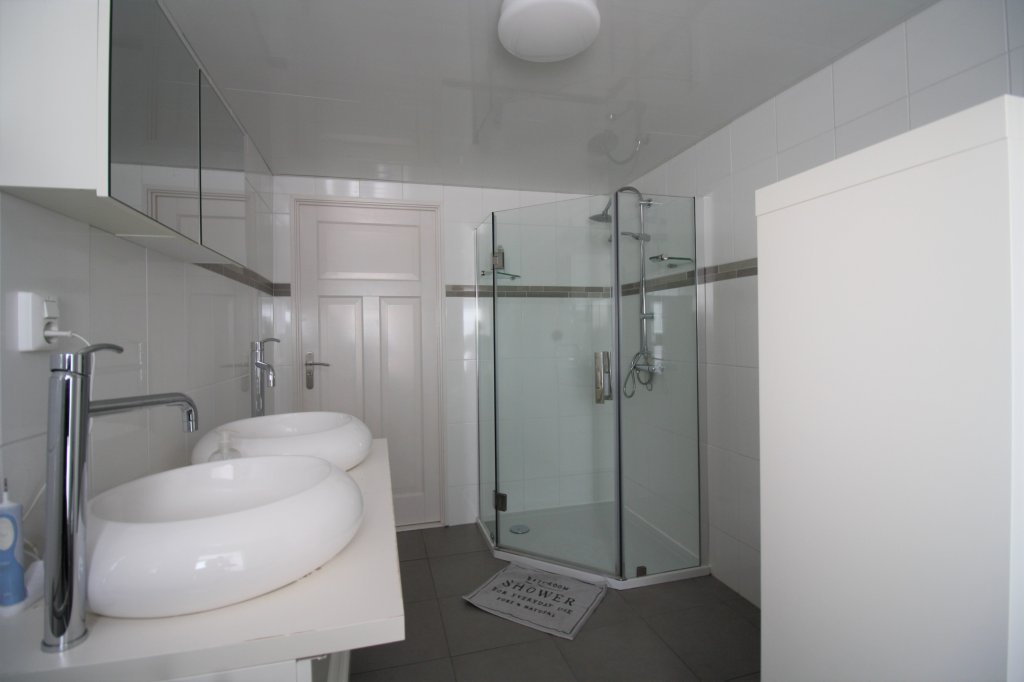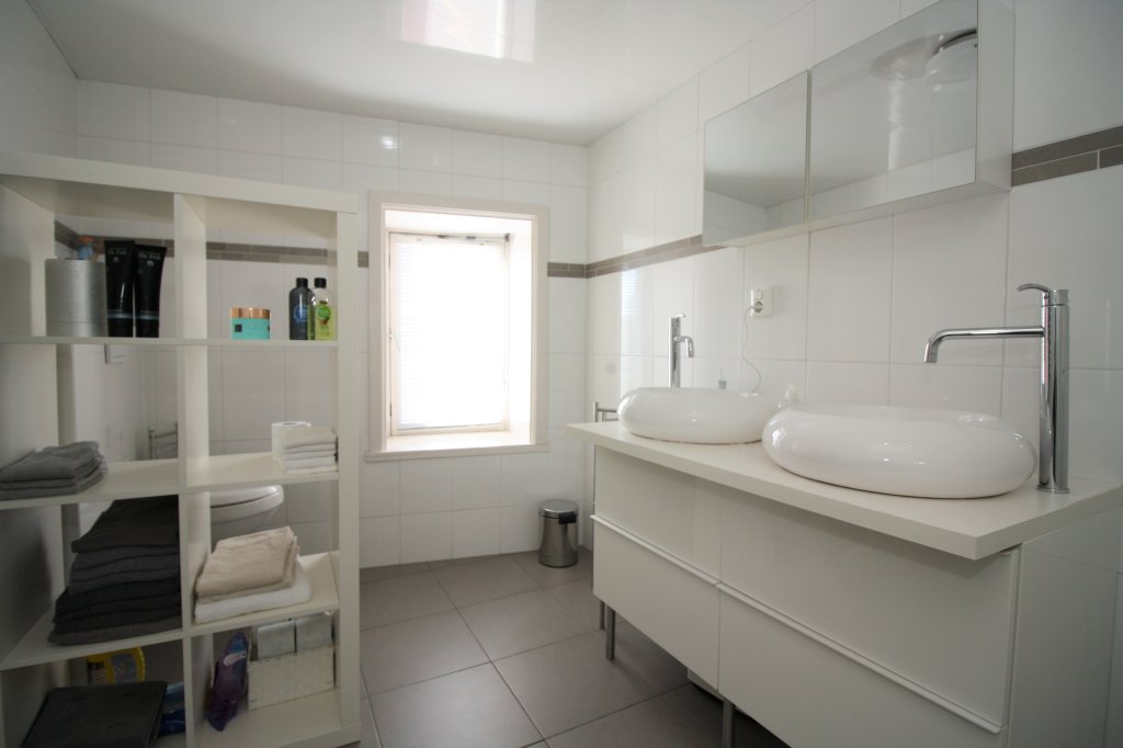 De badkamer bevind zich op de 1e etage en grenst aan de woonkamer. Deze nette badkamer is voorzien van twee elegante waskommen, een douchecabine met thermostatische douchekranen, een design radiator en een hangend toilet.