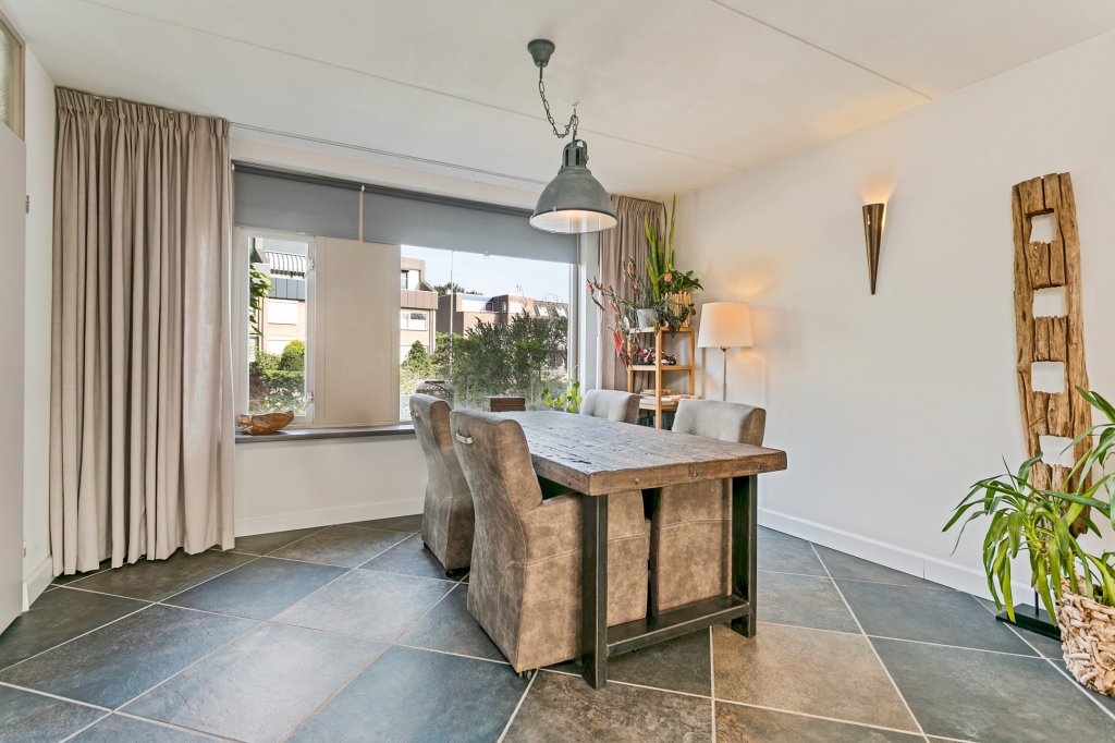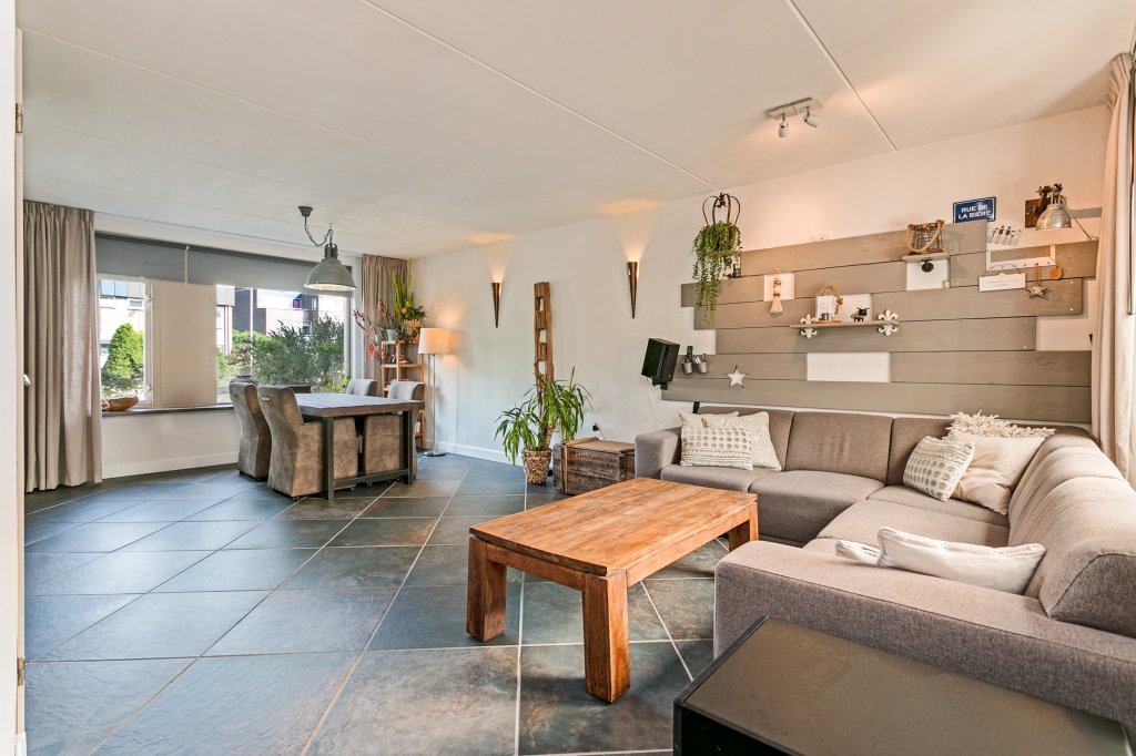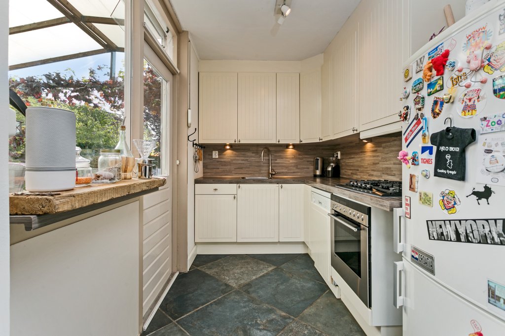 Men komt de woning binnen via de hal met meterkast en toilet. De woonkamer (± 32 m²) is een aangename lichte ruimte te noemen. De semi-open keuken (± 5,5 m²) is modern ingericht in L-opstelling en beschikt over een vaatwasser, oven, gaskookplaat, afzuigkap en voldoende kastruimte. De keuken geeft toegang tot het overdekte terras in de achtertuin. Zowel de woonkamer als de keuken zijn op moderne wijze afgewerkt middels een plavuizen vloer, strak gestuukte wanden en spuitwerk plafonds. De gehele begane grond beschikt over vloerverwarming.