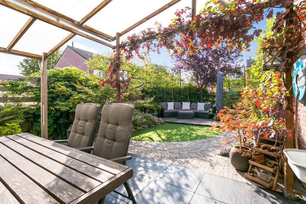 De achtertuin is verzorgd en groenrijk ingericht met meerdere terrassen om zo op ieder moment van de dag te genieten van de zon. Een overkapping zorgt eveneens voor een beschutte plek voor de minder mooie dagen van het jaar. De aangebouwde stenen berging (3.21 x 1.90 m) biedt de woning extra opslagruimte.