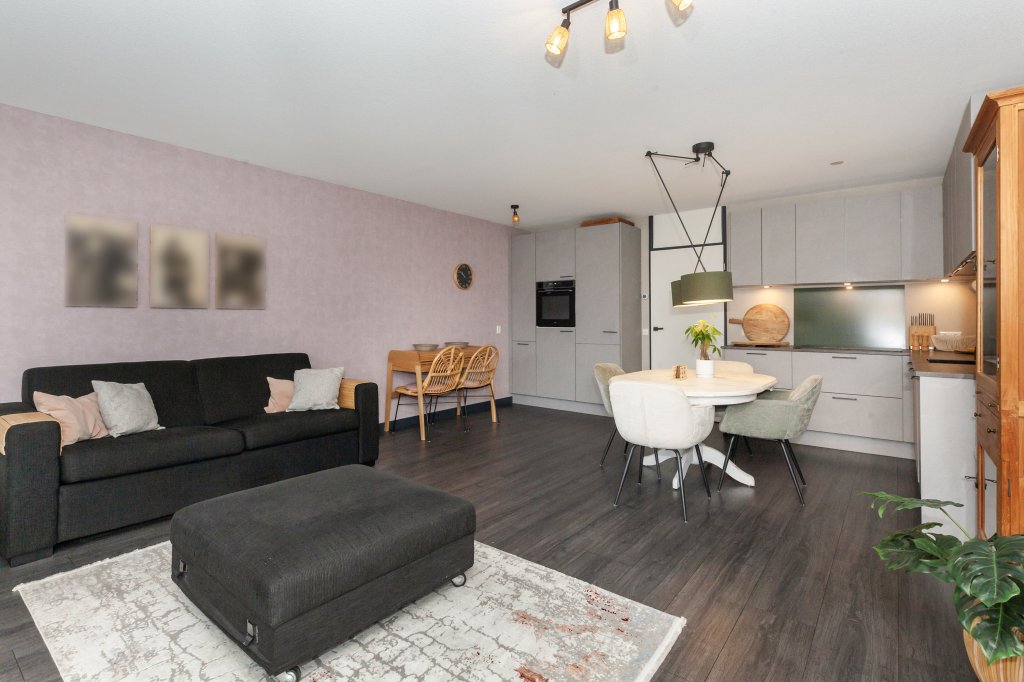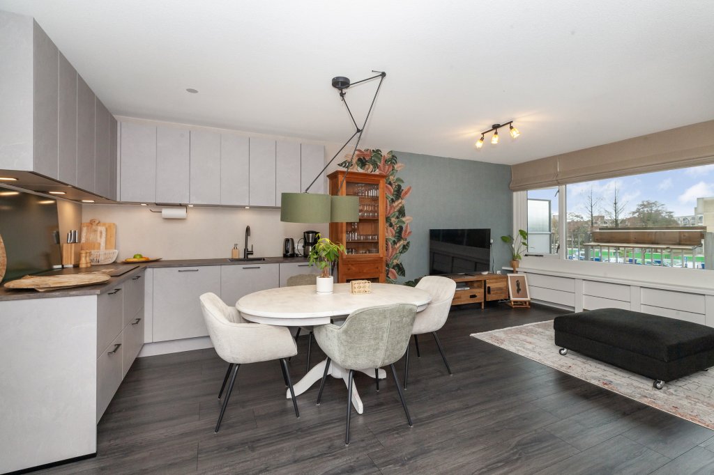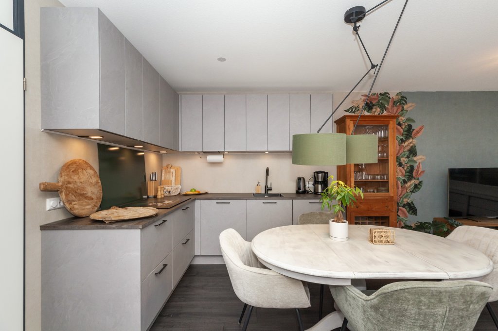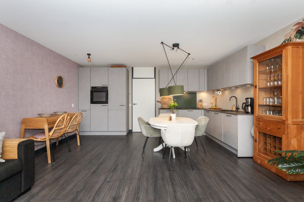 Open keuken, voorzien van: voldoende kastruimte, een inductiekookplaat met ingebouwde afzuiger, koel/-vriescombinatie, vaatwasser en een combi-oven. De gehele woning is voorzien van een laminaat-vloer.