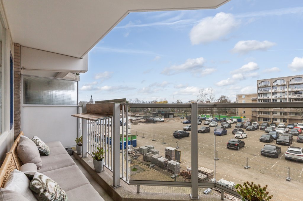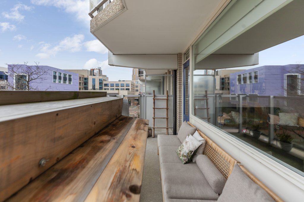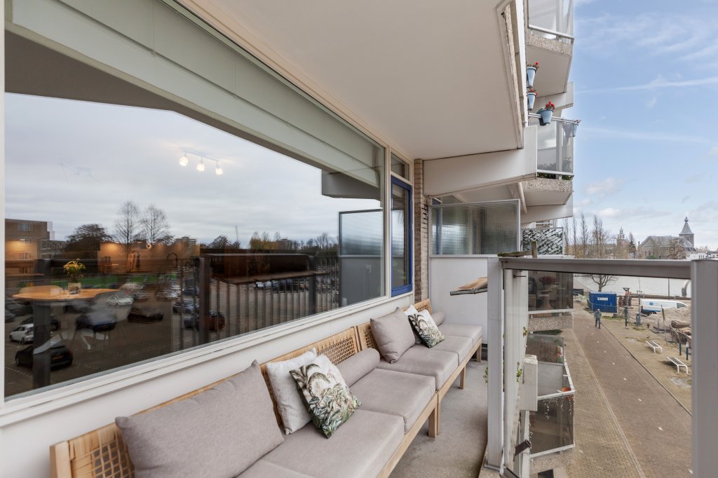 Lichte woonkamer met grote ramen. Toegang tot het balkon, over de volledige breedte van het appartement, gelegen op het zuidwesten met mooi vrij uitzicht over het water.