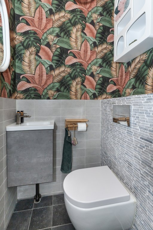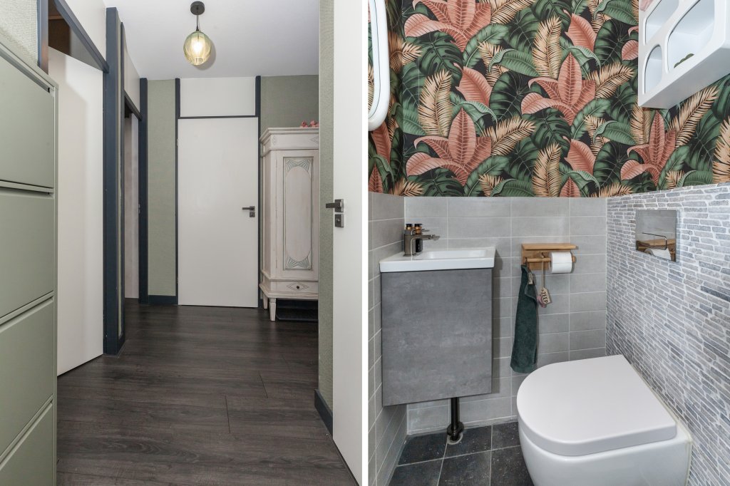 Huisentree: L-vormige hal, separaat modern hangend toilet.
