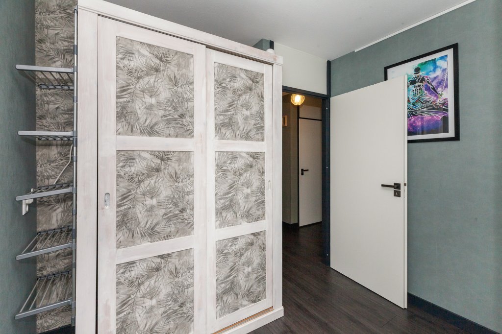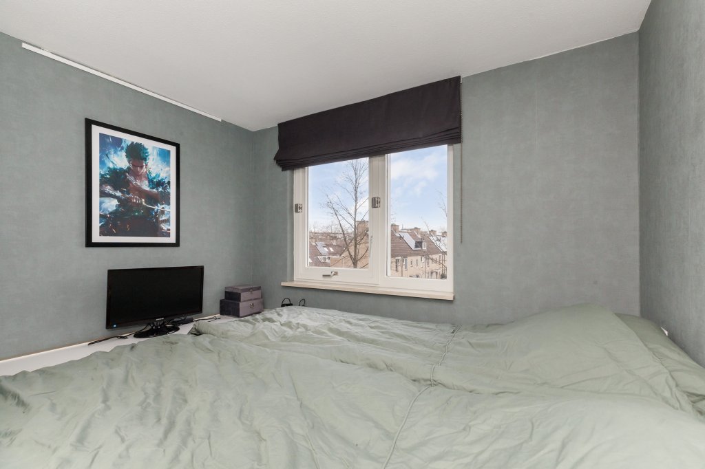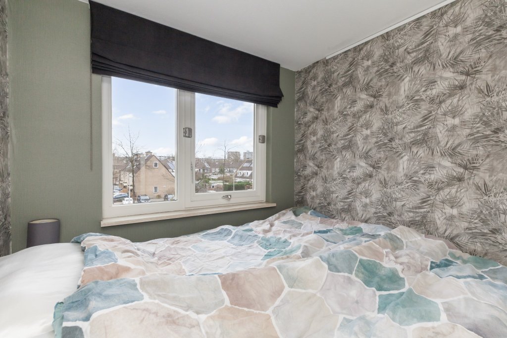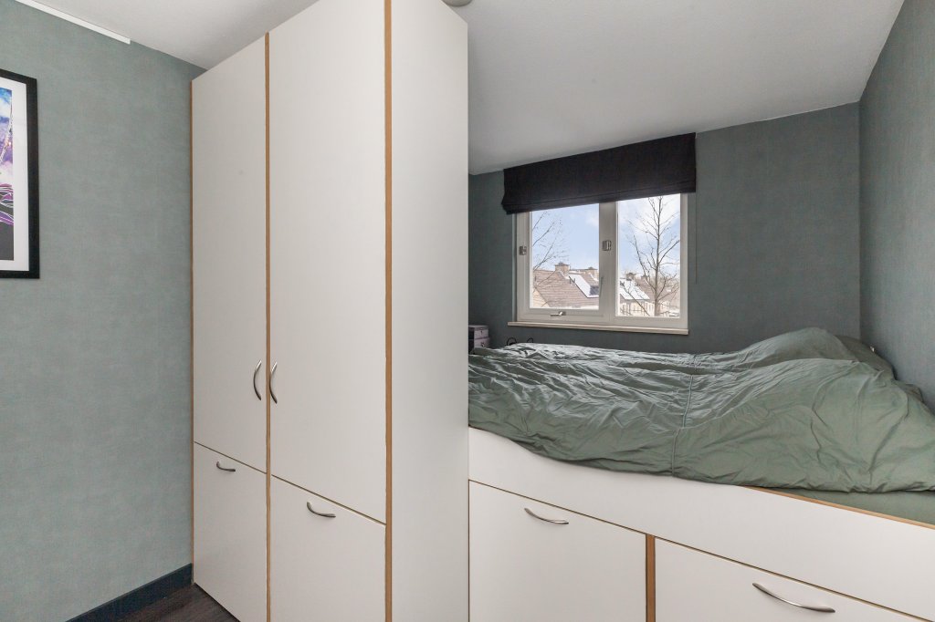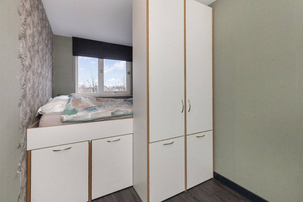 Twee slaapkamers, aan de voorzijde gelegen, waarvan de grote slaapkamer is voorzien van een 2-persoons bed met opbergruimte en de kleinere slaapkamer met een 2-persoonsbed. De geheel betegelde, moderne badkamer is voorzien van een bad waarin ook gedoucht kan worden, wastafelmeubel met spiegelkast en verlichting, handdoekradiator en de opstelplaats voor een wasmachine en droger in een kast. Er is een eigen berging in de onderbouw en een eigen parkeerplaats met beugel op het parkeerterrein.