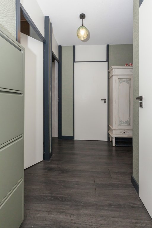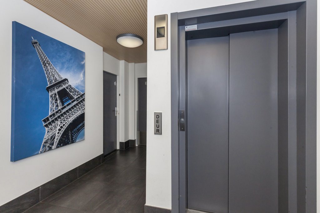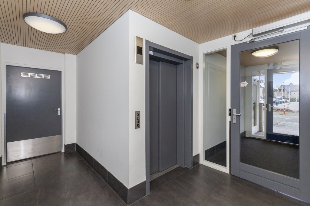 Entree, hal met bellentableau en brievenbussen, afgesloten tussenhal met trappenhuis en lift.