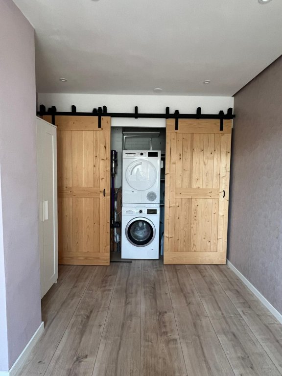 Entree/hal met garderobe, meterkast met glasvezel internet. Verder is er de toilet met fonteintje. De slaapkamer op de begane grond is ingericht met laminaat, radiatorombouw en plafond met inbouwspots. Achter de houten schuifpanelen in de kamer staan de wasmachine en droger opgesteld.