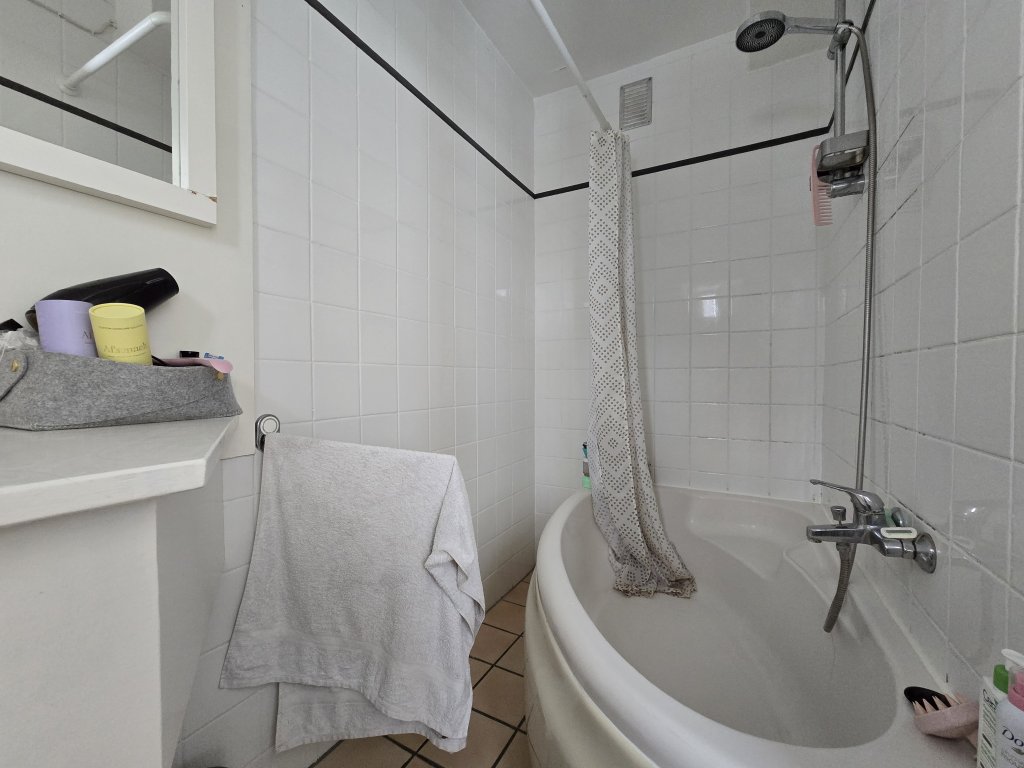 Master bedroom. Bijkeuken met wasmachine-aansluiting en toegang tot het tweede balkon en de badkamer. Nette badkamer, voorzien van wastafel, douche en ligbad.