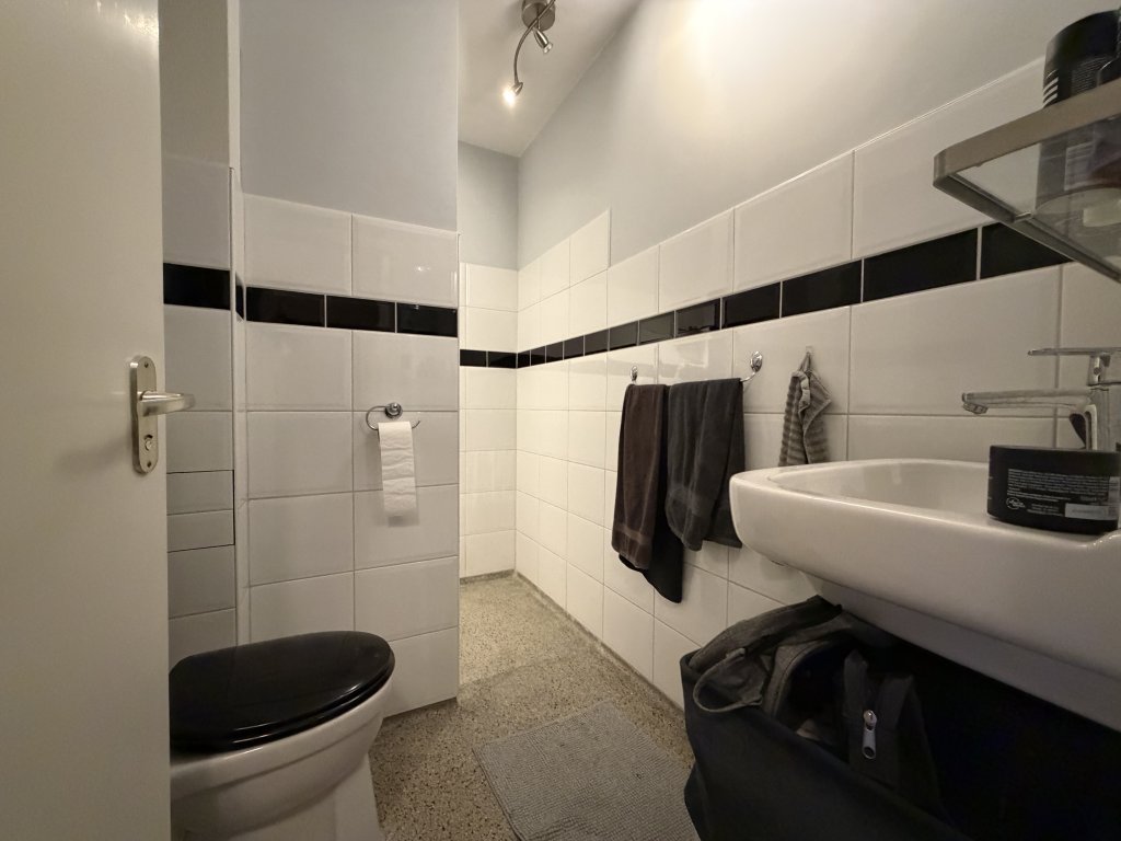 The modern bathroom is fitted with a shower, toilet, and washbasin. On the ground floor of the apartment complex, there is a shared bicycle storage area.