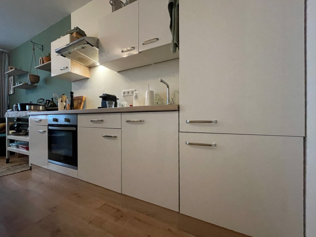 Entree, lichte woonkamer met open keuken. Nette, moderne keuken voorzien van elektrische kookplaat met afzuigkap, oven en koelkast.