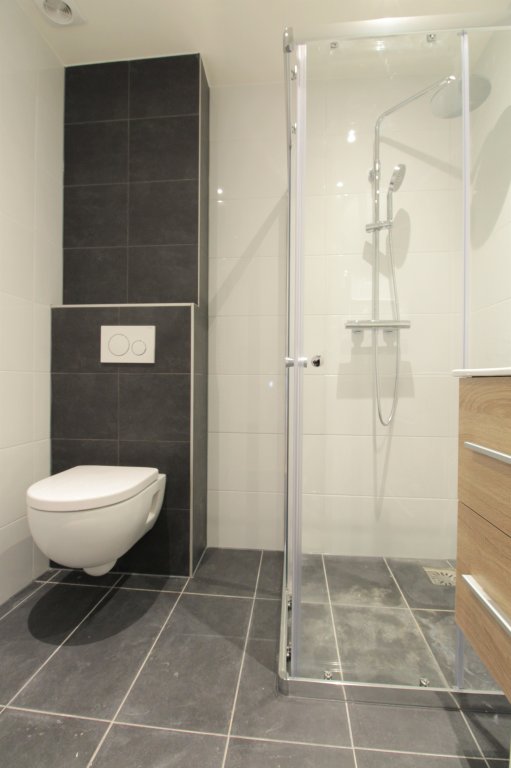 Master bedroom. Nieuwe moderne badkamer uitgerust met douche, wastafelmeubel en hangend toilet. Hal met toegang naar de achterkant van het pand, met de wasmachine aansluiting en cv-ketel.