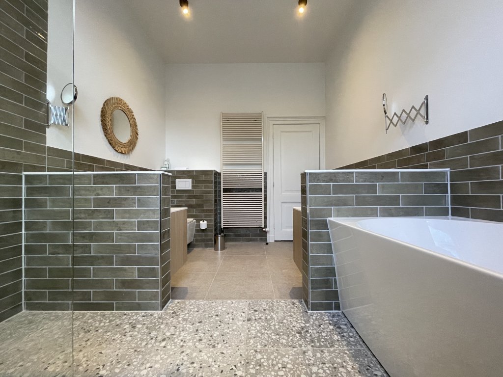 Nieuwe, ruime badkamer voorzien van ligbad, inloop douche, toilet, design radiator en dubbele wastafels.