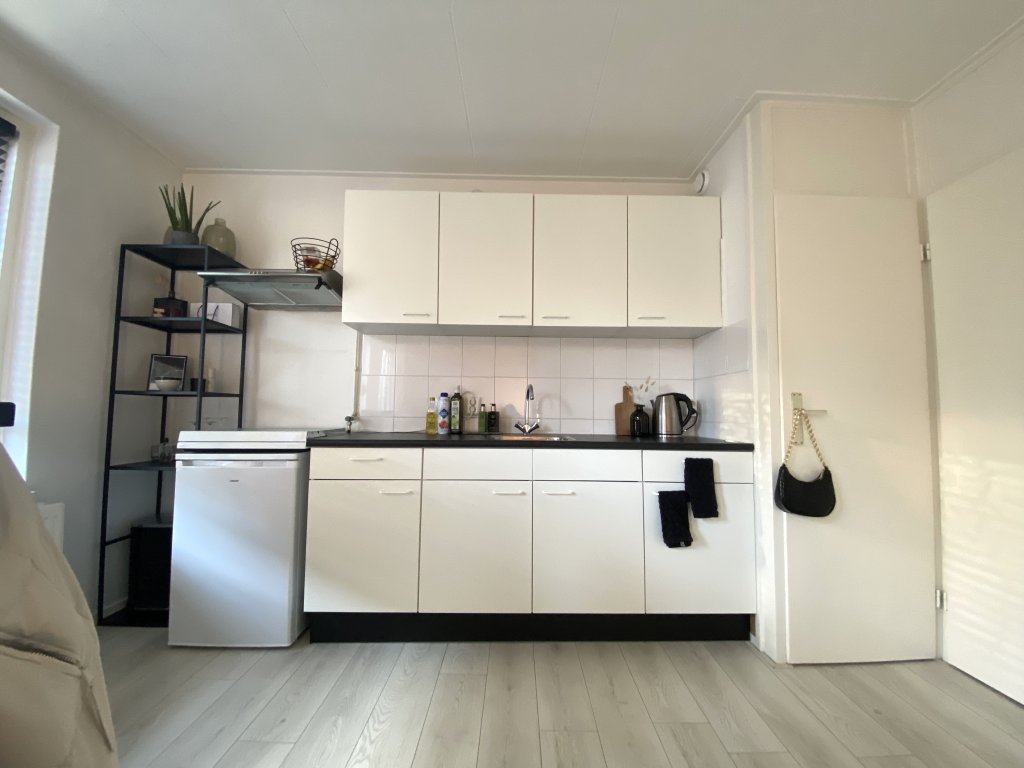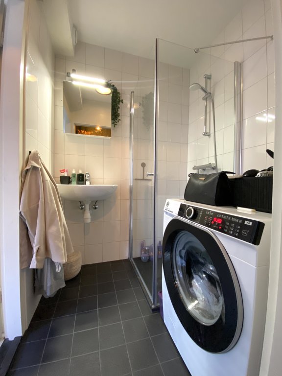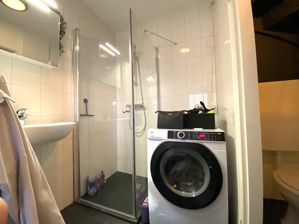 Lichte woonkamer met open keuken. Badkamer uitgerust met wastafel, douchecabine en wasmachineaansluiting.