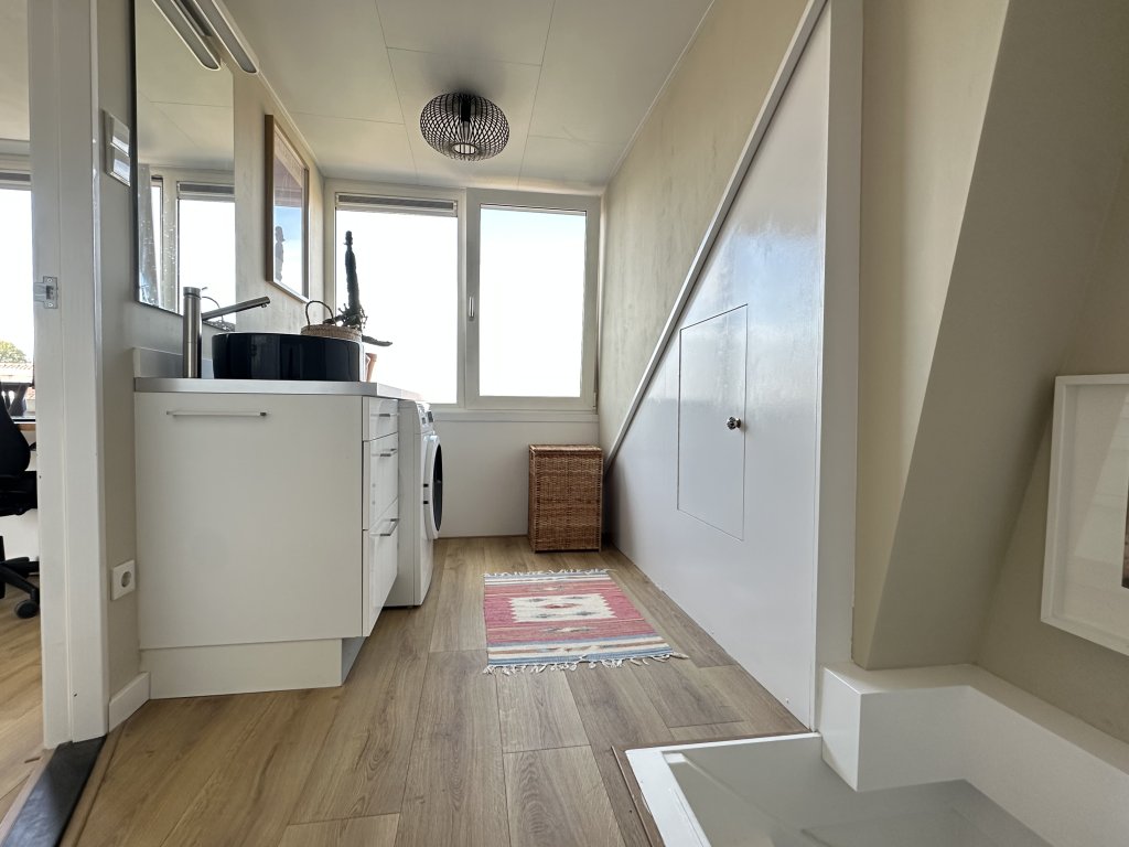 Voorzolder met wastafelmeubel en wasmachineaansluitingen. Zeer royale vierde logeer/werkkamer.