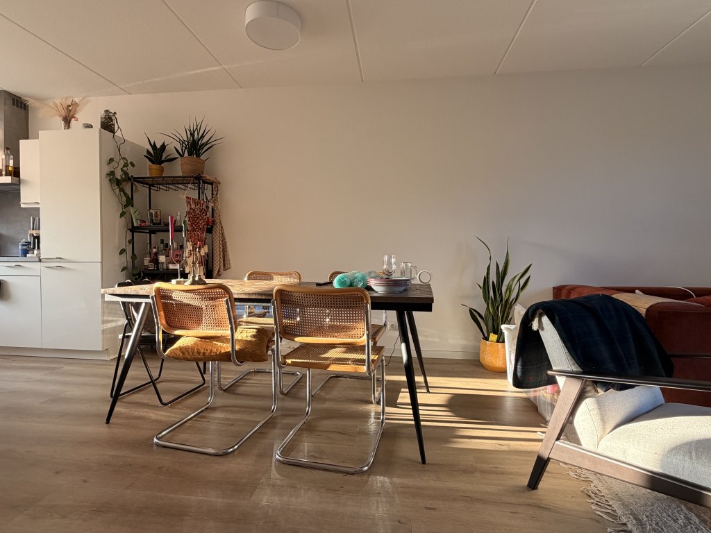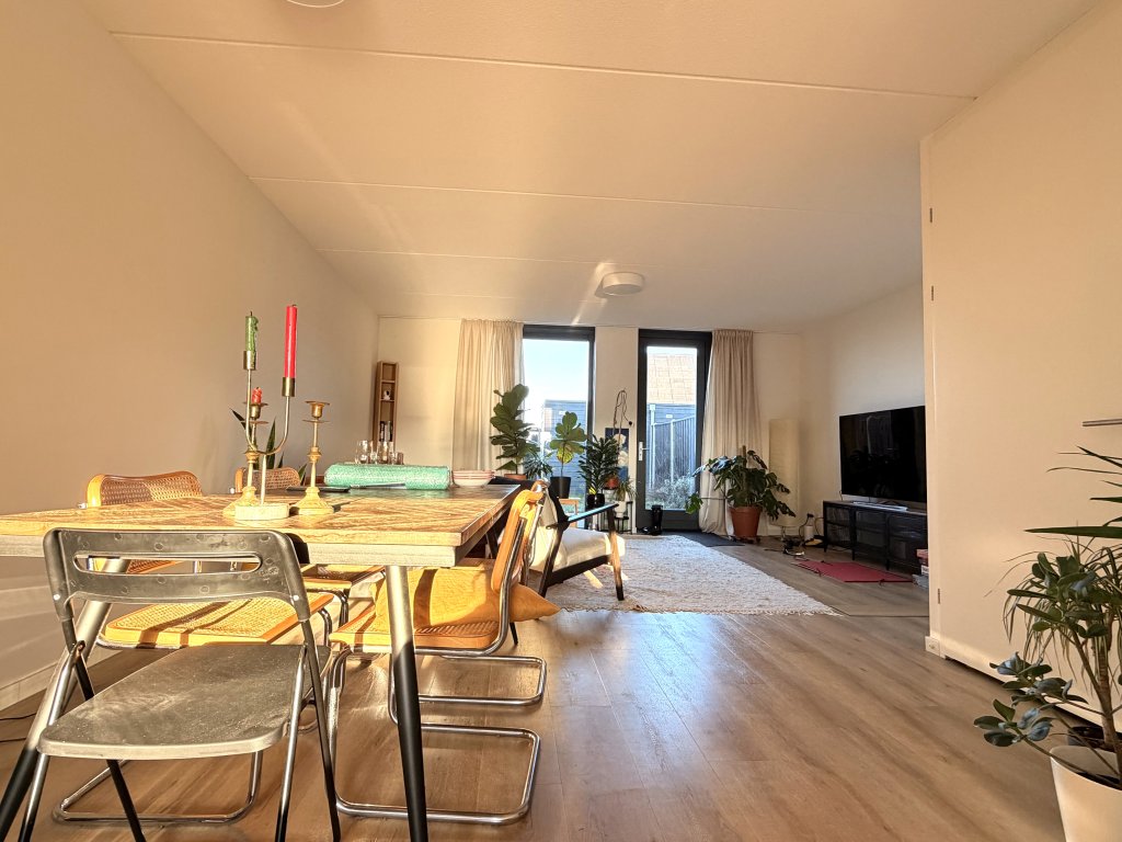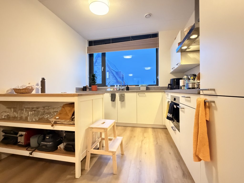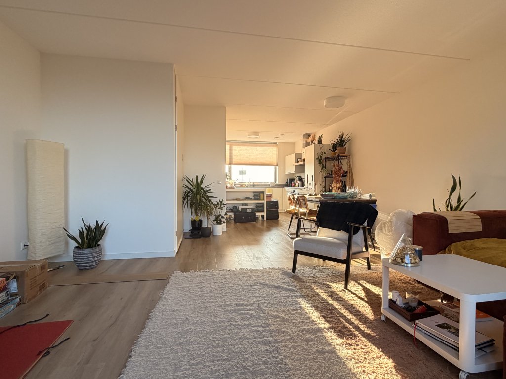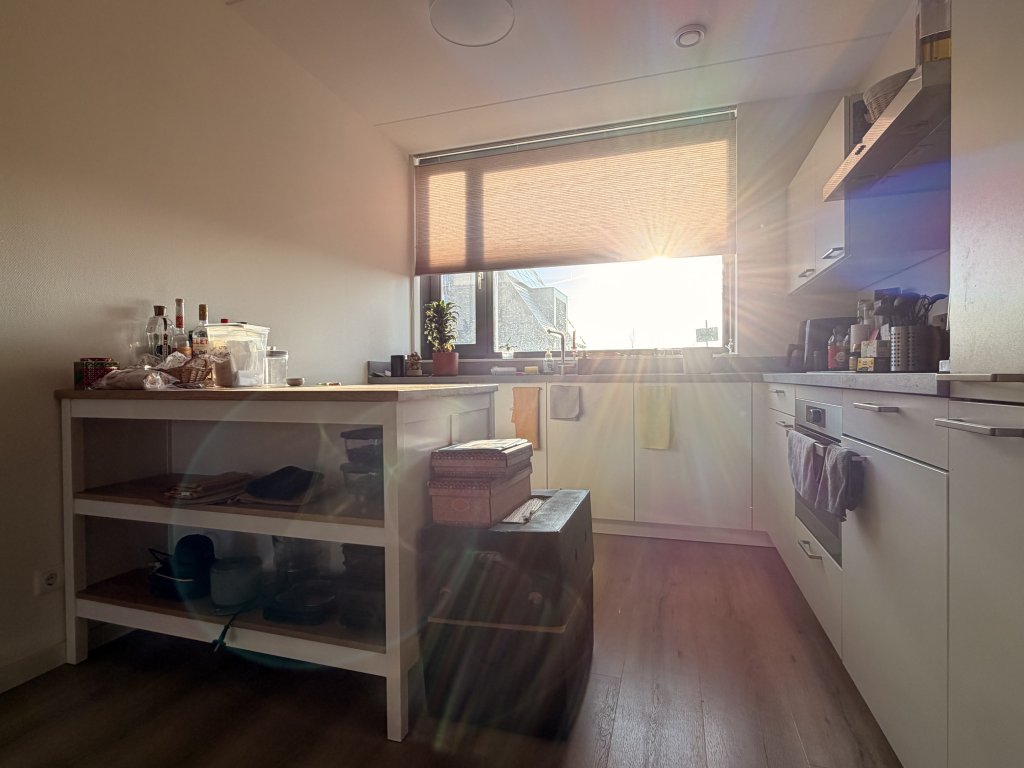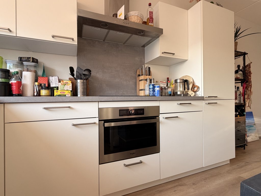 Ruime, lichte woonkamer met open keuken. De moderne keuken is voorzien van een spoelbak, inductiekookplaat met afzuigkap, koel-vriescombinatie, combi-oven en vaatwasser.
