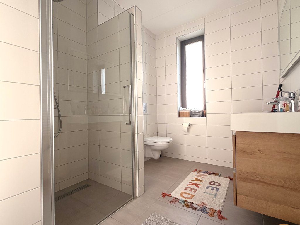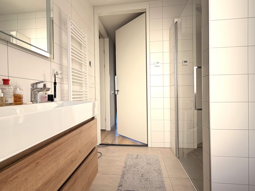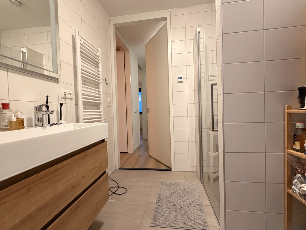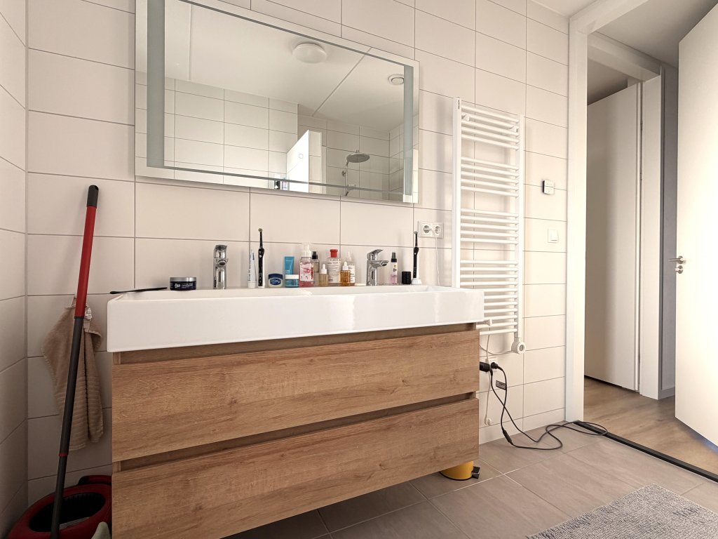 Overloop met toegang tot de drie slaapkamers en de badkamer. De moderme badkamer is voorzien van een douche, dubbel wastafelmeubel, spiegel met ledverlichting, designradiator en toilet.